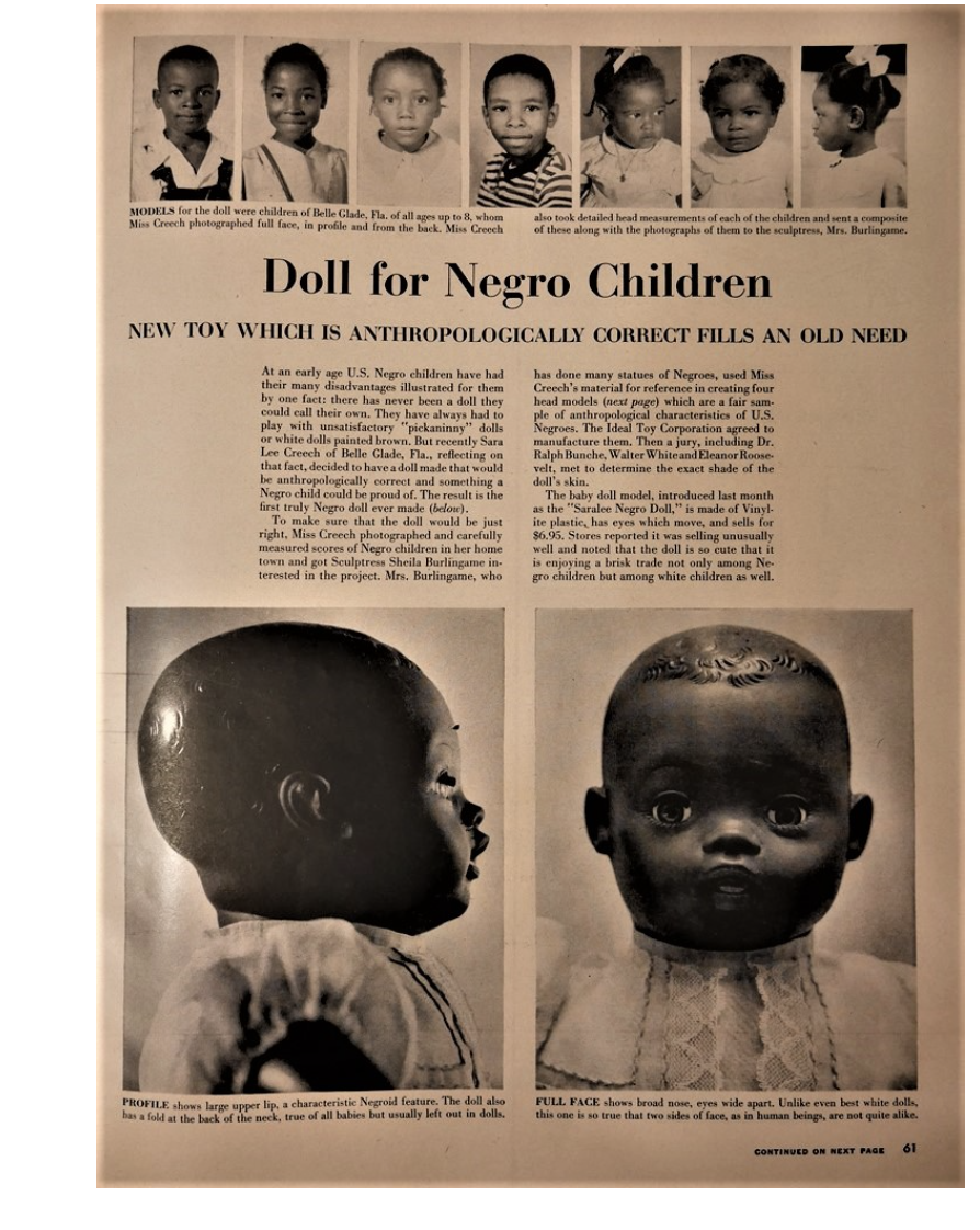 In 1949 Sara Lee Creech, a businesswoman and social activist of Belle Glade, Florida, observed two African American girls playing with light-complexioned dolls. Creech thought it was wrong that the girls had no dolls to play with that looked like them, and she became determined to provide an “anthropologically correct” doll for black children. When she began her quest, Creech may have not known how truly important her doll idea would turn out be.